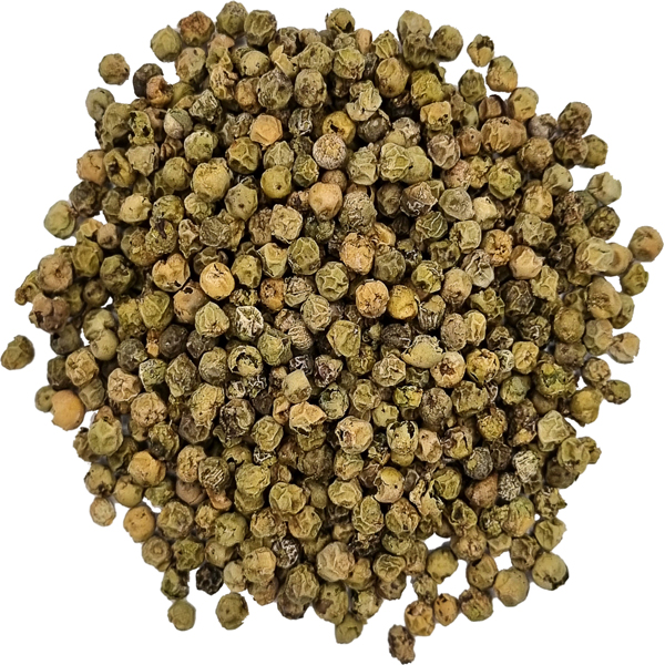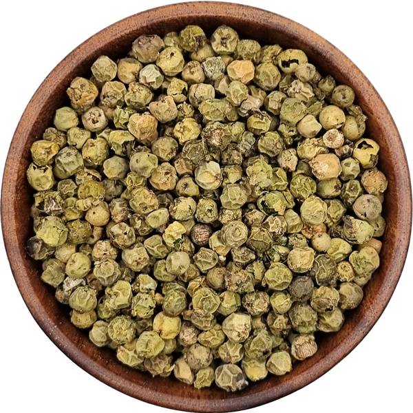 Grüner Pfeffer wird aus unreifen Beeren der Pflanze Piper nigrum gewonnen und ist eine erfrischende Gewürzsorte mit einer leichten Schärfe und einer würzigen Note. Die unreifen Beeren werden geerntet und anschließend entweder in Essig oder Salzlake eingelegt, um ihre Haltbarkeit zu erhöhen und ihre charakteristisch grüne Farbe beizubehalten. Durch den Einlegeprozess behalten die grünen Pfefferbeeren ihre knackige Konsistenz und werden geschmacklich belebt. Sie verleihen den Speisen eine angenehme Schärfe, die weniger intensiv ist als die von schwarzem oder rotem Pfeffer. Grüner Pfeffer wird oft in Saucen, Salaten, Dressings und Fleischgerichten verwendet, um einen Hauch von Schärfe und Frische hinzuzufügen. Der grüne Pfeffer zeichnet sich auch durch sein erfrischendes und würziges Aroma aus. Er hat einen leicht herben Geschmack, der den Gerichten eine gewisse Tiefe verleiht. Die grünen Pfefferkörner können ganz oder gemahlen verwendet werden, je nachdem, welchen Effekt man erzielen möchte. Grüner Pfeffer wird oft als Alternative zu schwarzen oder weißen Pfeffersorten verwendet, um den Geschmack von Gerichten aufzupeppen und ihnen eine frische Note zu verleihen. Er passt gut zu Geflügel, Meeresfrüchten und Gemüsegerichten. Sein erfrischendes Aroma und die leicht pikante Schärfe machen ihn zu einer beliebten Zutat in der Küche. Es ist erwähnenswert, dass grüner Pfeffer in eingelegter Form erhältlich ist, was ihn länger haltbar macht und eine praktische Option für den Einsatz in verschiedenen Gerichten bietet. Die eingelegten grünen Pfefferkörner können einfach aus dem Glas genommen und direkt verwendet werden. Insgesamt ist grüner Pfeffer eine erfrischende Gewürzsorte, die eine subtile Schärfe und ein würziges Aroma bietet. Mit seiner charakteristischen grünen Farbe verleiht er den Speisen eine ansprechende Optik und belebt den Geschmack von Gerichten auf eine erfrischende Art und Weise.